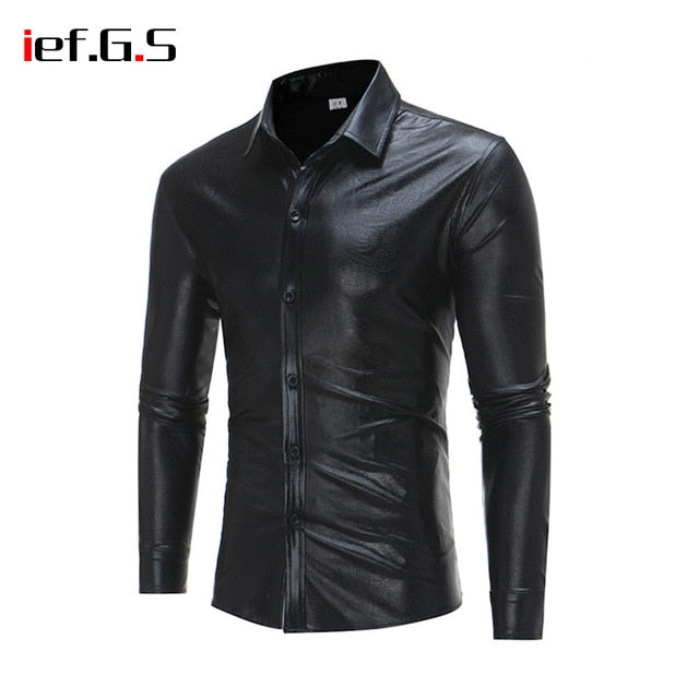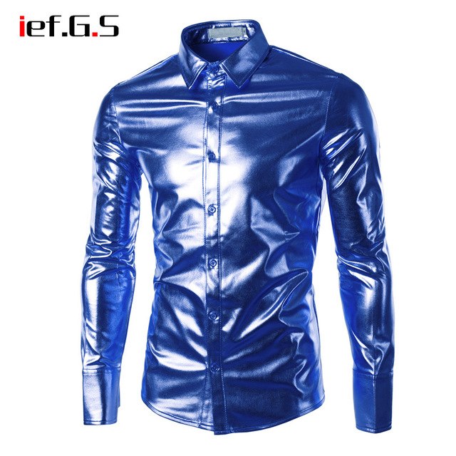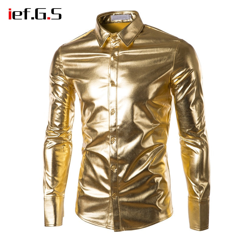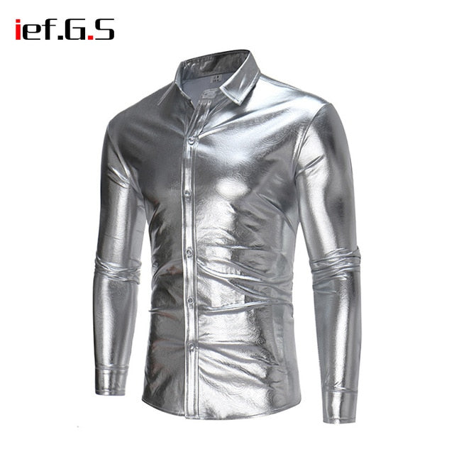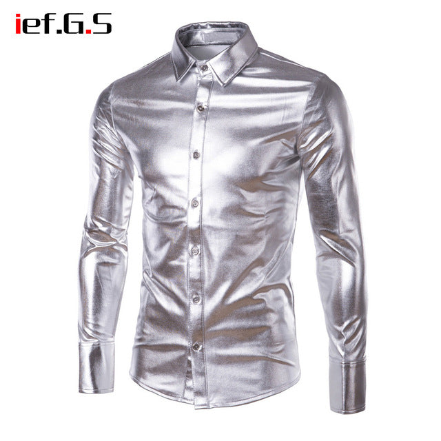 IEF.G.S Men Glossy Shirt Casual Slim Fit Long Sleeve Gold Shiny Silver Streetwear Camisa Hombre Men Clothes 2018 Floral Shirt